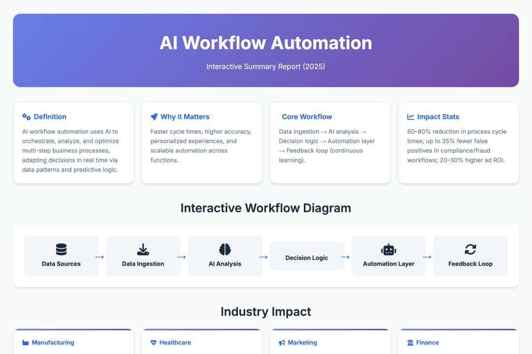 AI workflow automation refers to using artificial intelligence to orchestrate, analyze, and optimize business processes that were previously manual or rule-based.
