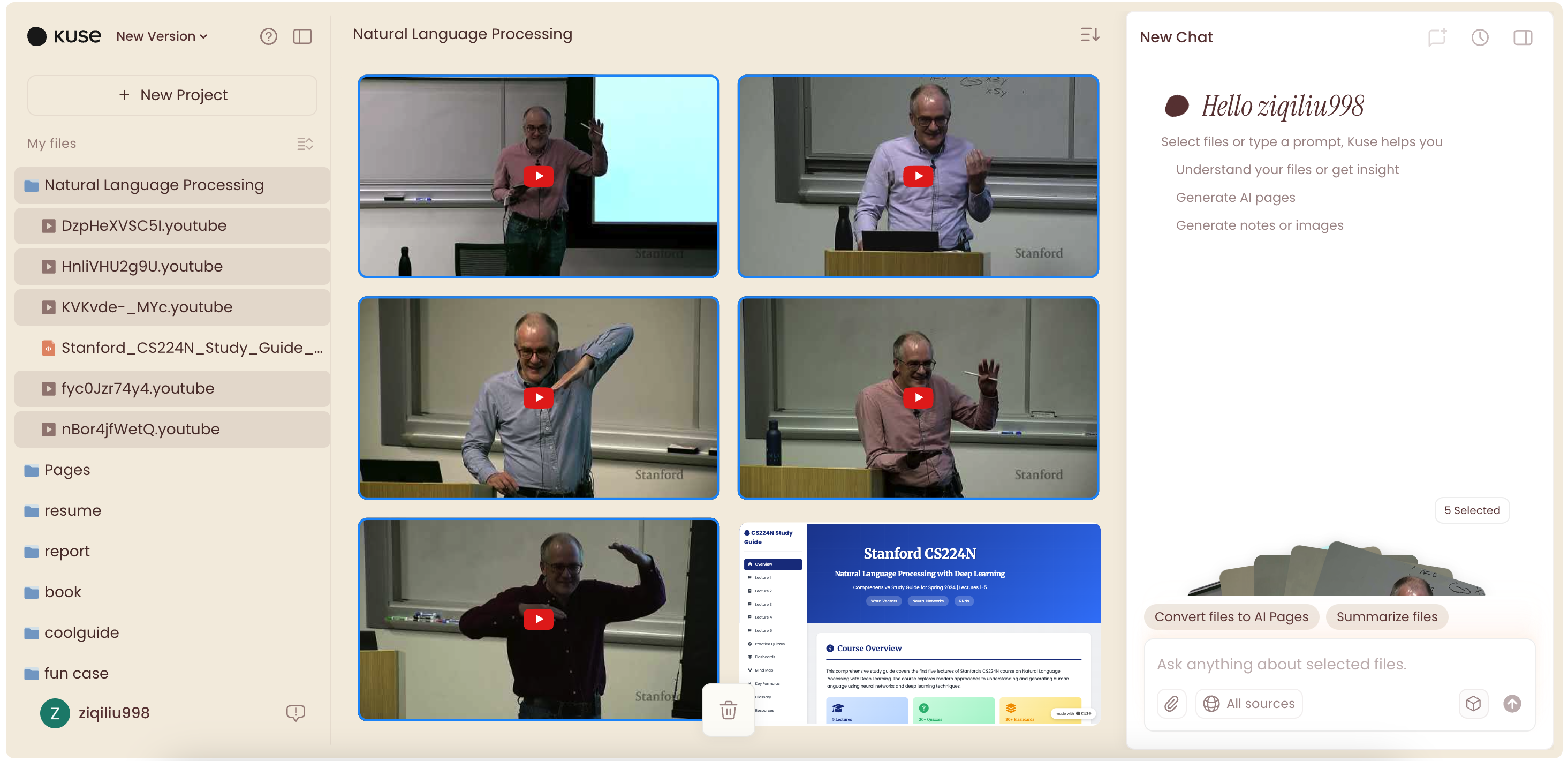 With Kuse, multiple lectures and materials are processed together—not in isolation.