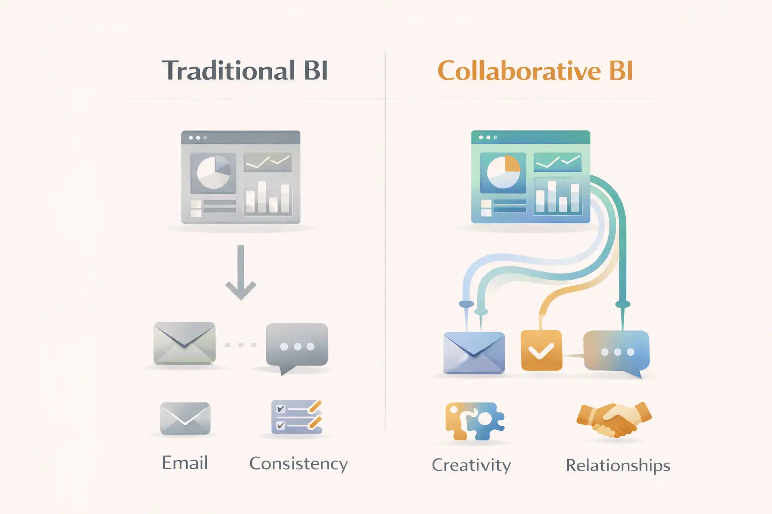 Traditional BI requires separate conversations to add this context. The report lives in one place. The discussion happens in another. The connection between insight and interpretation fragments.