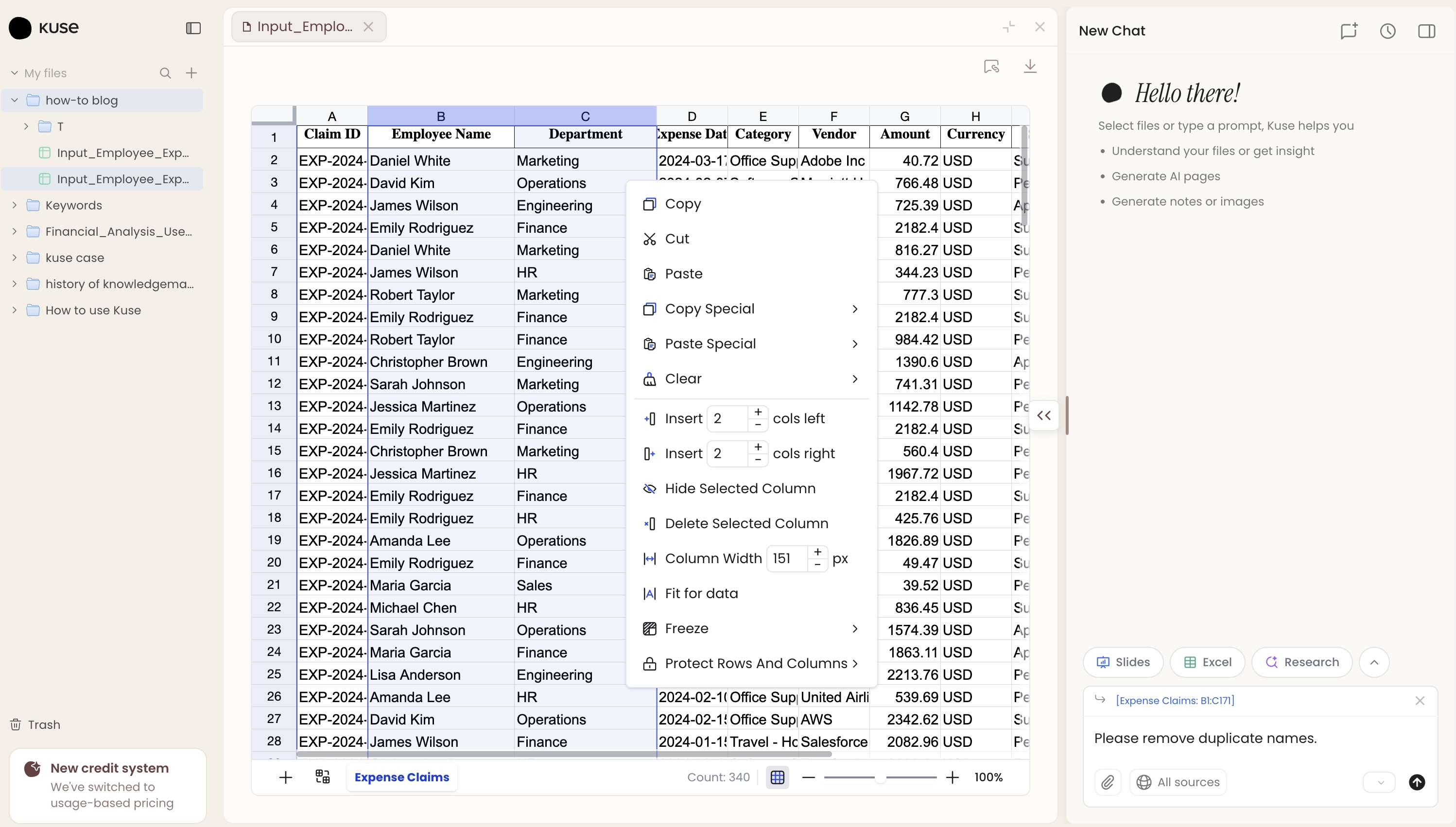 Go beyond suggestions. Kuse plans, executes, and iterates across files to turn Excel inputs into finished outputs.