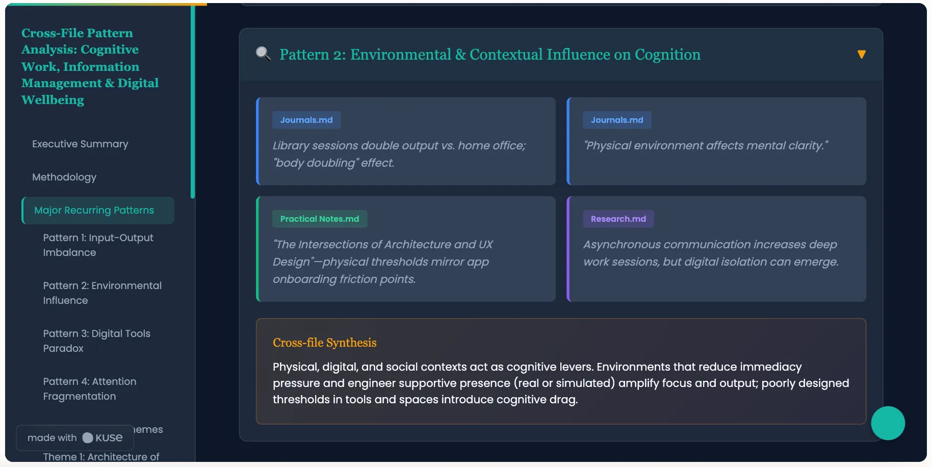 Analyze your notes, journals, or research files to surface patterns, themes, and connections you might have missed.