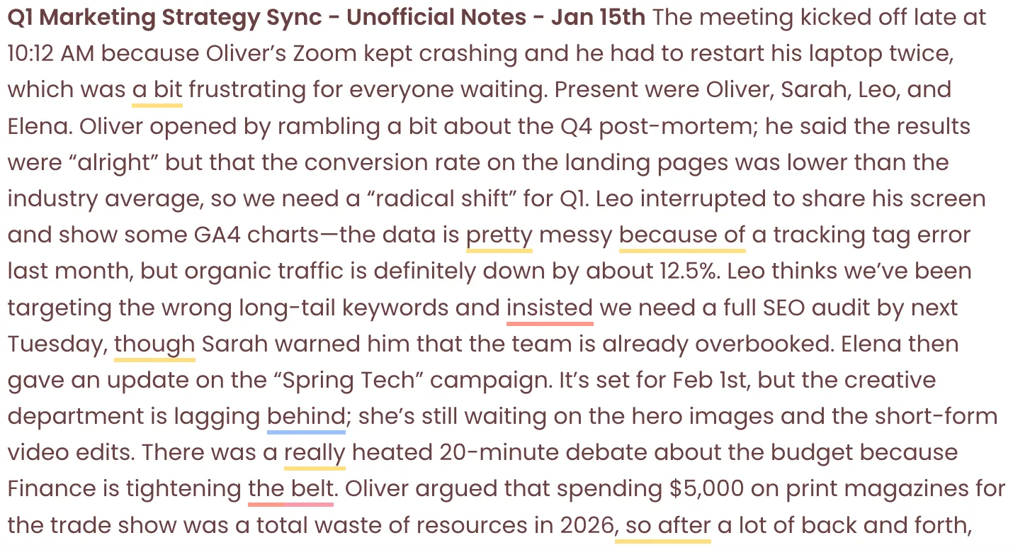 Extract themes, key points, and action items from meeting notes, interviews, or lecture recordings.