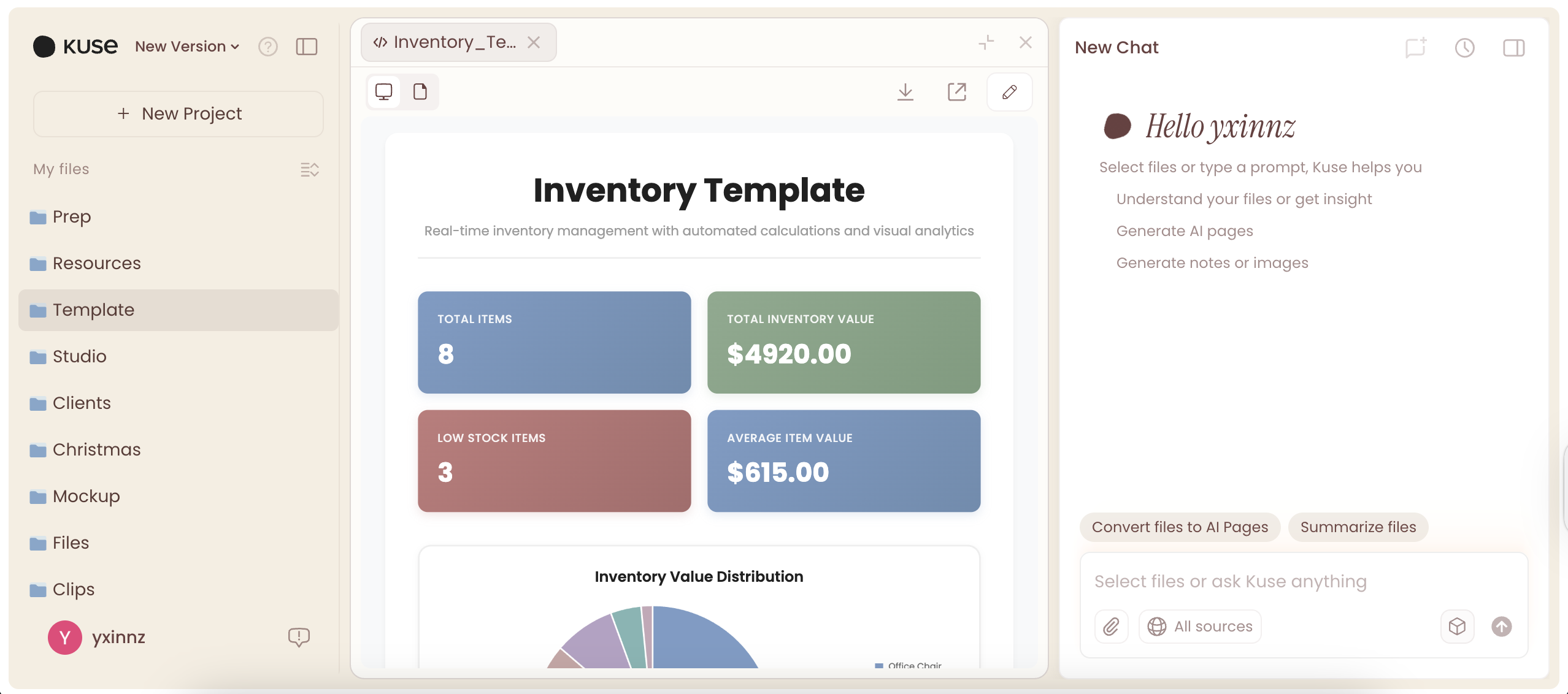 This free inventory template from Kuse includes automatic calculations, visual dashboards, and low stock alerts—features that typically require complex formulas or premium software subscriptions.