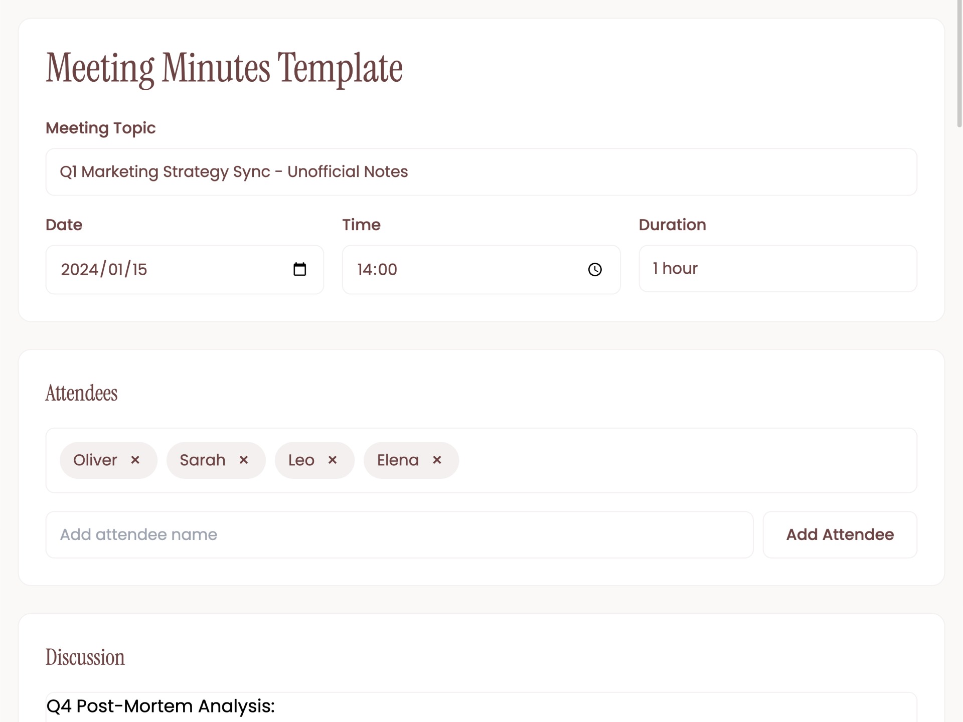 Instead of manually listing names, attendees are added as structured entries. This makes it clear who participated, who is accountable for follow-ups, and who should be looped in on outcomes.