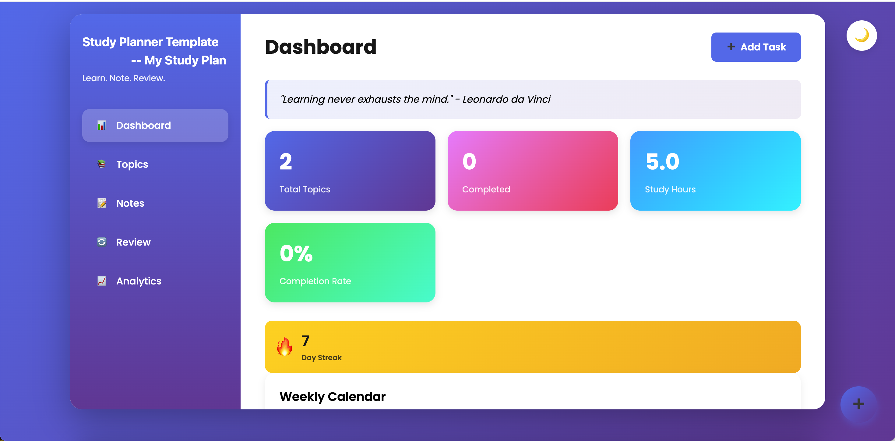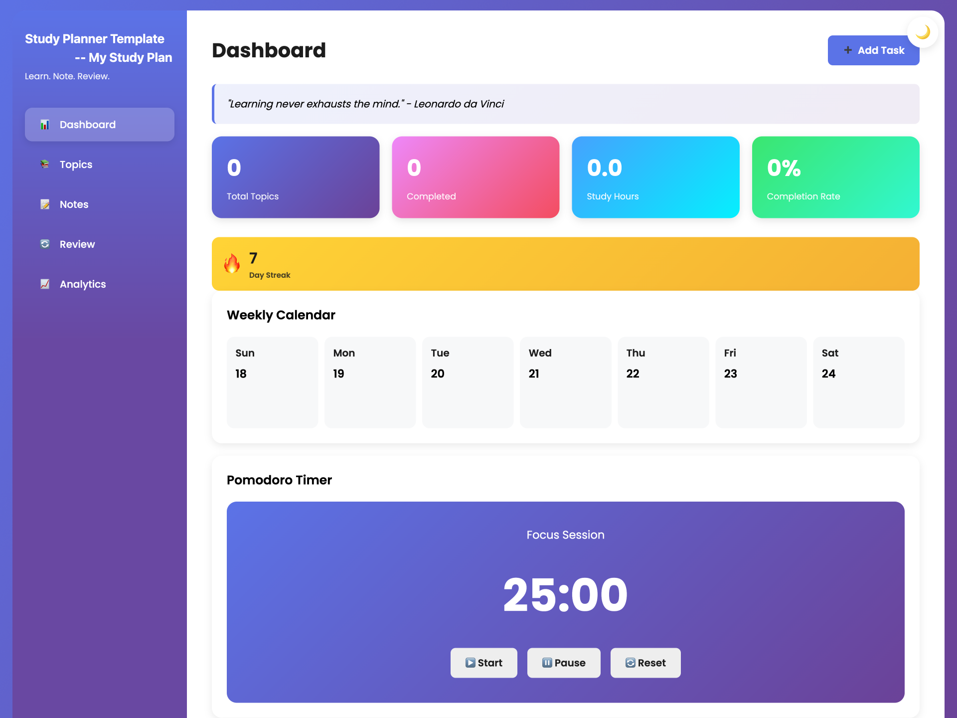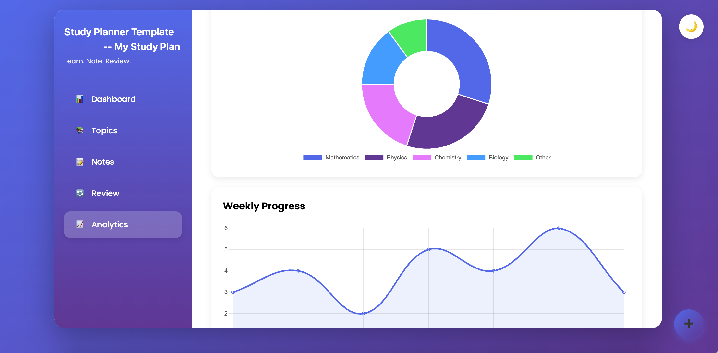 This study planner template goes beyond a simple timetable. It combines topic planning, note-taking, review scheduling, and progress analytics into one interactive workspace—so studying becomes something you manage, not something that overwhelms you.