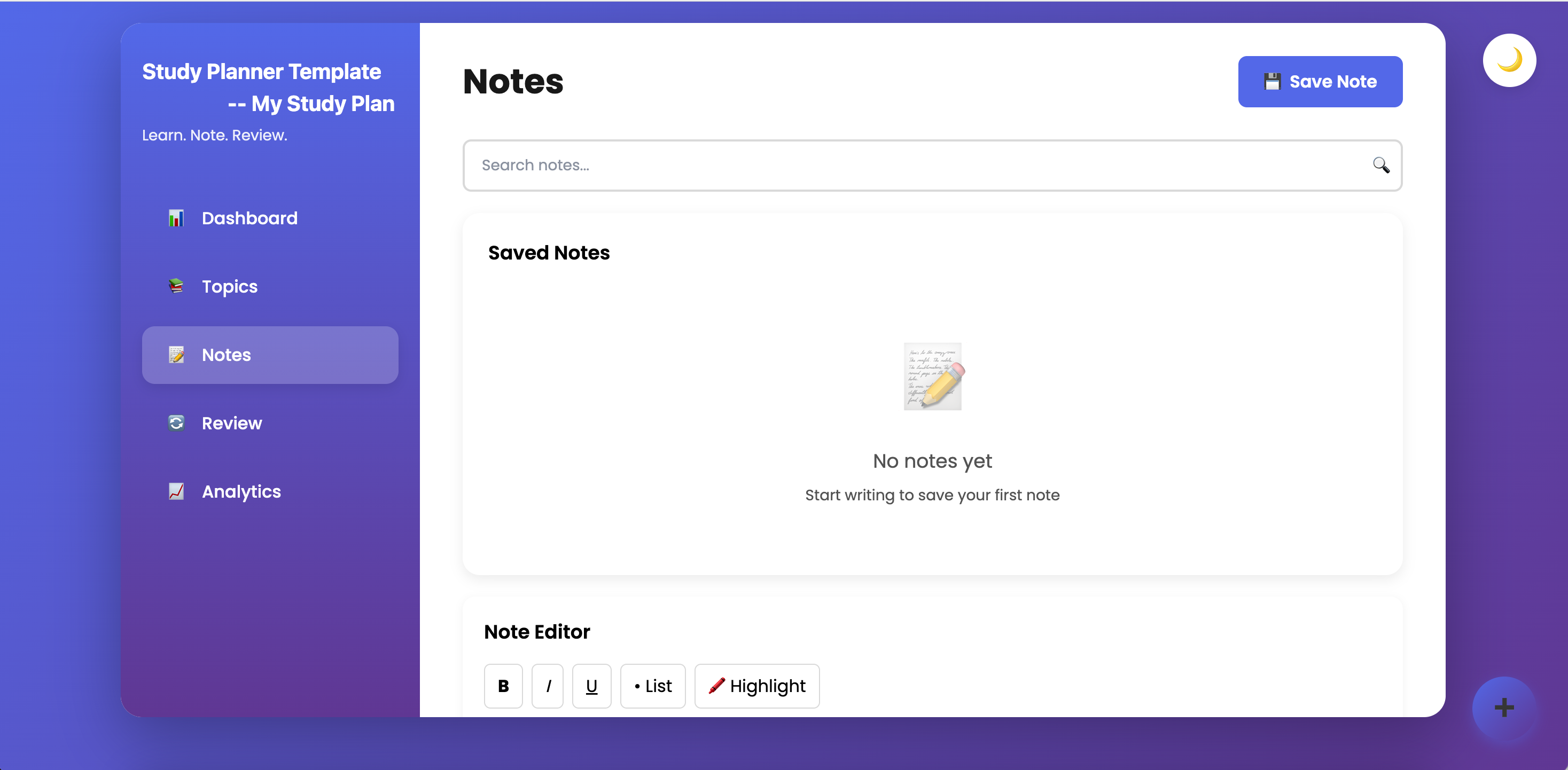 Because everything is editable, you can adjust topics, notes, and schedules as your workload or deadlines change.